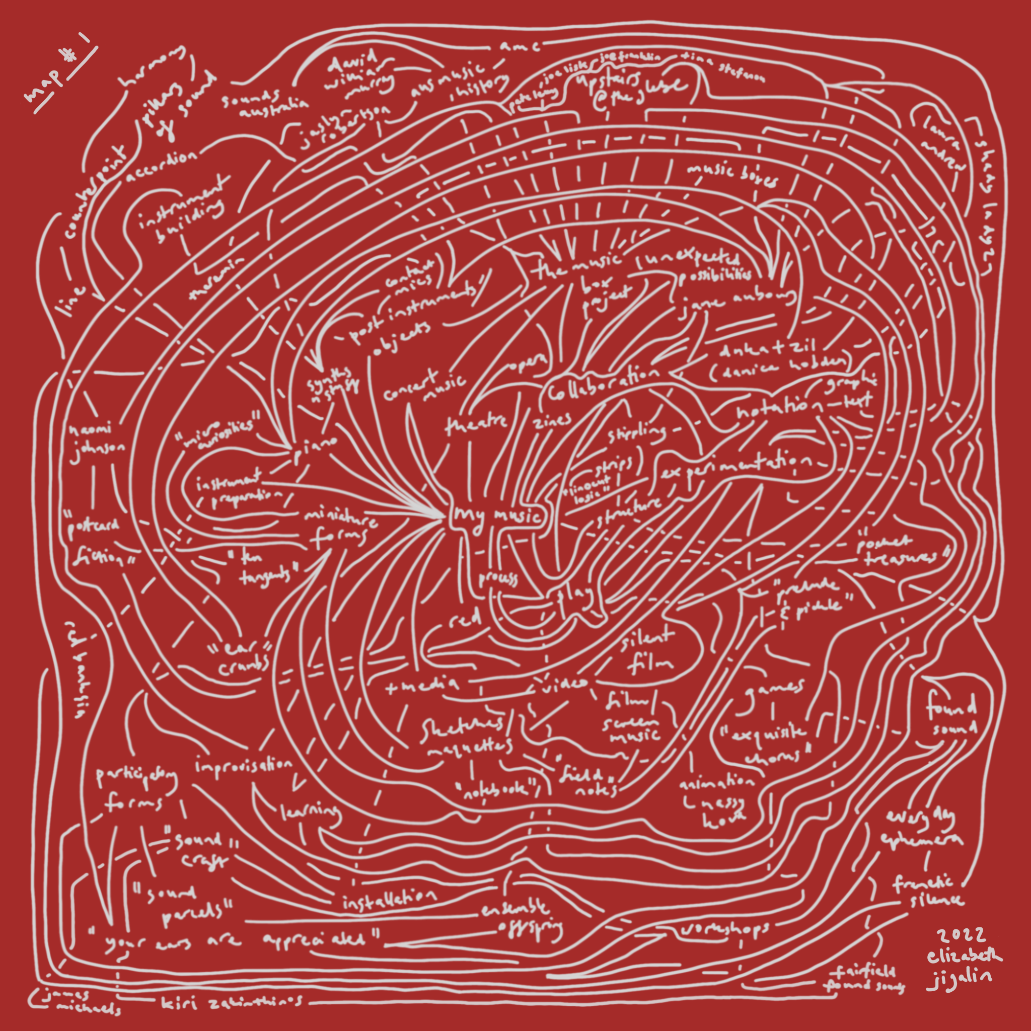 the graphic below is the result of an exercise where I wanted to see what would happen if I were to attempt to map out some of the ideas and people behind my music. I specifically want to do this task without any preplanning to experiment with the accidental topography that would emerge from a relatively haphazard/stream of consciousness-driven process.